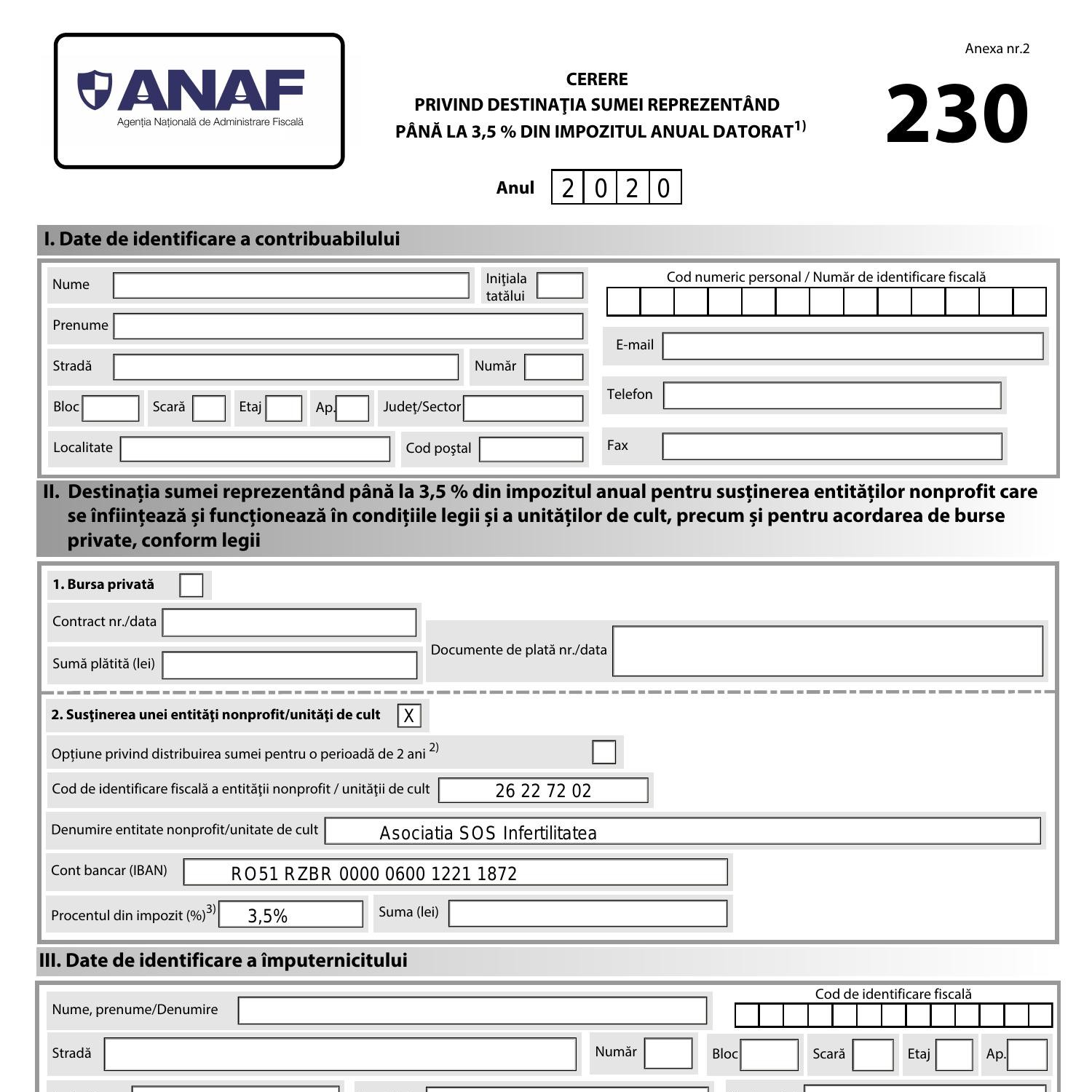 Potrivit noului formular 230, o parte din impozitul pe venit, respectiv 3,5%, se va duce către bursele private în anumite condiții și numai. Potrivit noului formular 230, o parte din impozitul pe venit, respectiv 3,5%, se va duce către bursele private în anumite condiții și numai. 139/2020, emis de anaf, care a fost publicat pe 23 ianuarie în monitorul oficial. Pentru ediția precedentă, vedeți :