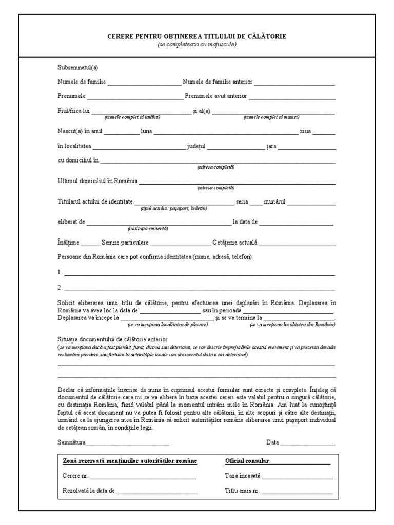 Formular Pentru Titlu De Calatorie. Stimaţi pasageri, dorim să aducem în atenţia dumnevoastră obligativitatea completării, înaintea începerii călătoriei, a unor formulare care conţin date solicitate de autorităţile străine şi care sunt absolut necesare în vederea intrării pe teritoriul ţării de destinaţie. Documentele necesare pentru eliberarea unui titlu de călătorie pentru un minor născut în românia sau în străinătate sunt următoarele: