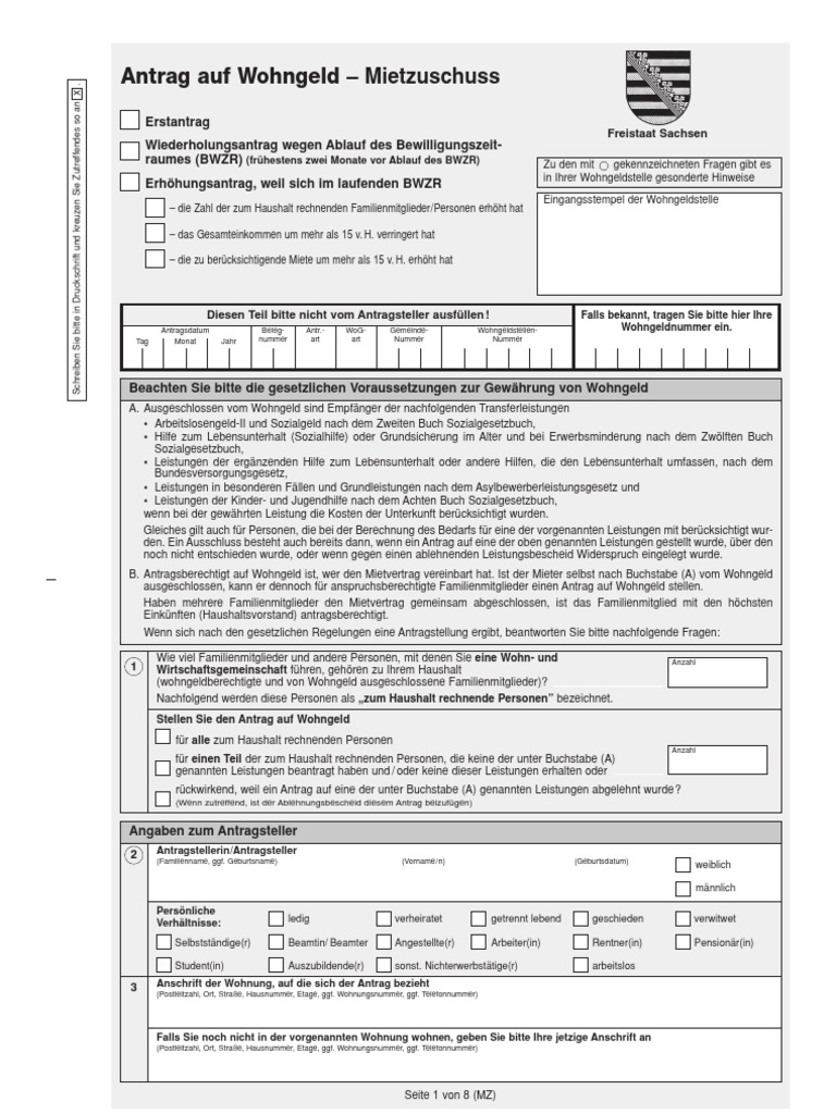Formular Wohngeld. Wohngeld gibt es sowohl als mietzuschuss für personen, die mieterin oder mieter einer wohnung sind, als auch als lastenzuschuss für eigentümerinnen und eigentümer von selbst genutztem. Beim wohngeld handelt es sich um eine sozialleistung, die nach § 22 wogg nur auf antrag gewährt wird.