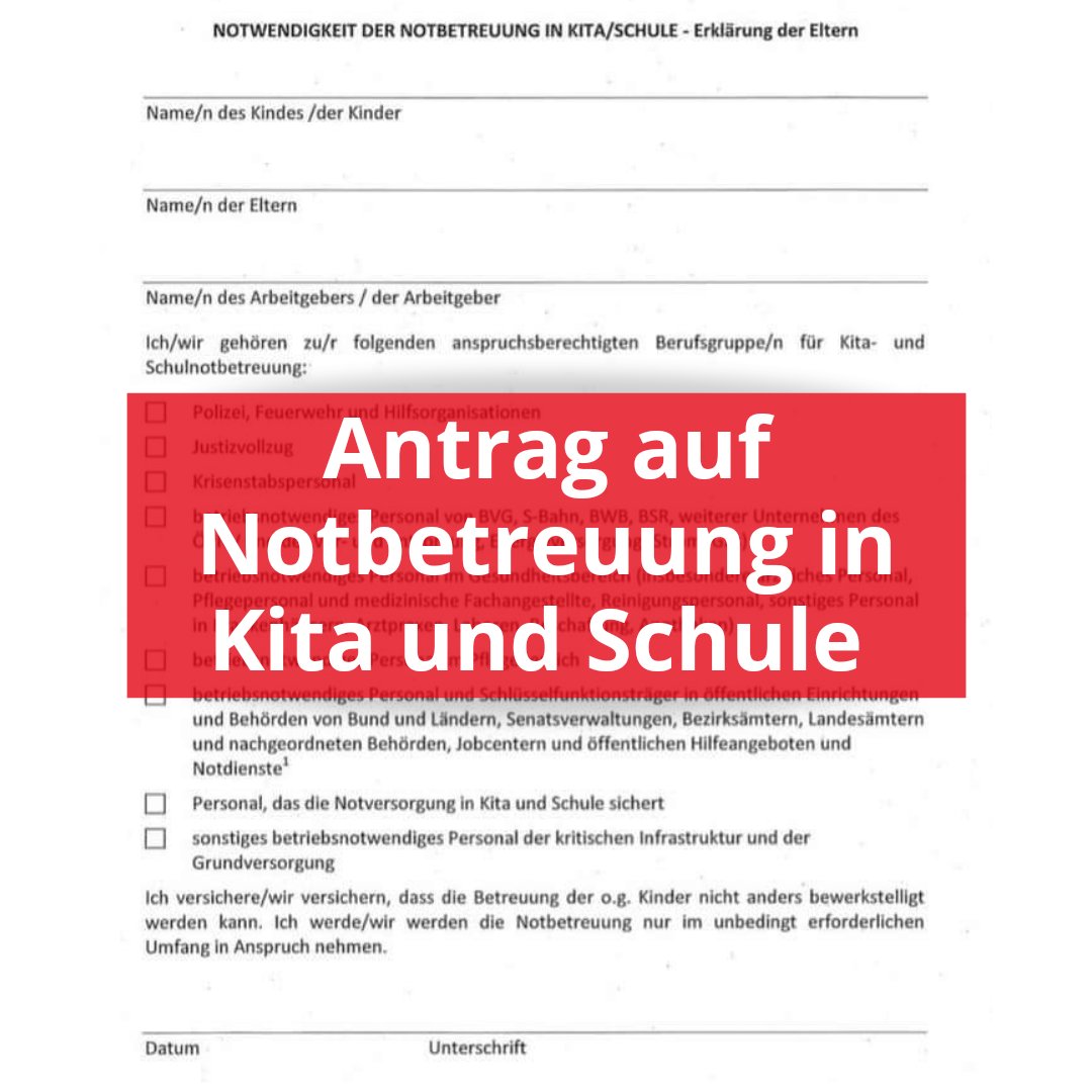 Die notbetreuung ist erforderlich, da ich oder ein*e andere*r erziehungsberechtigte*r ☐ beschäftigte/r im gesundheitsbereich, medizinischen bereich. Anbei finden sie das formular um notbetreuung um ihr (e) kind (er) anzumelden. Dieses formular geben sie bei der kita ab. Sind in der kita/hort erhältlich.