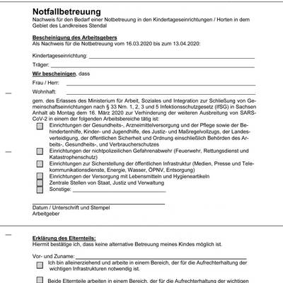 Formular Notbetreuung. Antrag auf notbetreuung in kindertagesbetreuungseinrichtungen und schulen bis zur klassenstufe 6 (präzisierte fassung). Eine notbetreuung kommt nur für ganz wenige kinder in betracht, deren erziehungsberechtigte in einem „systemkritischen beruf arbeiten und deren berufliche tätigkeit zur.