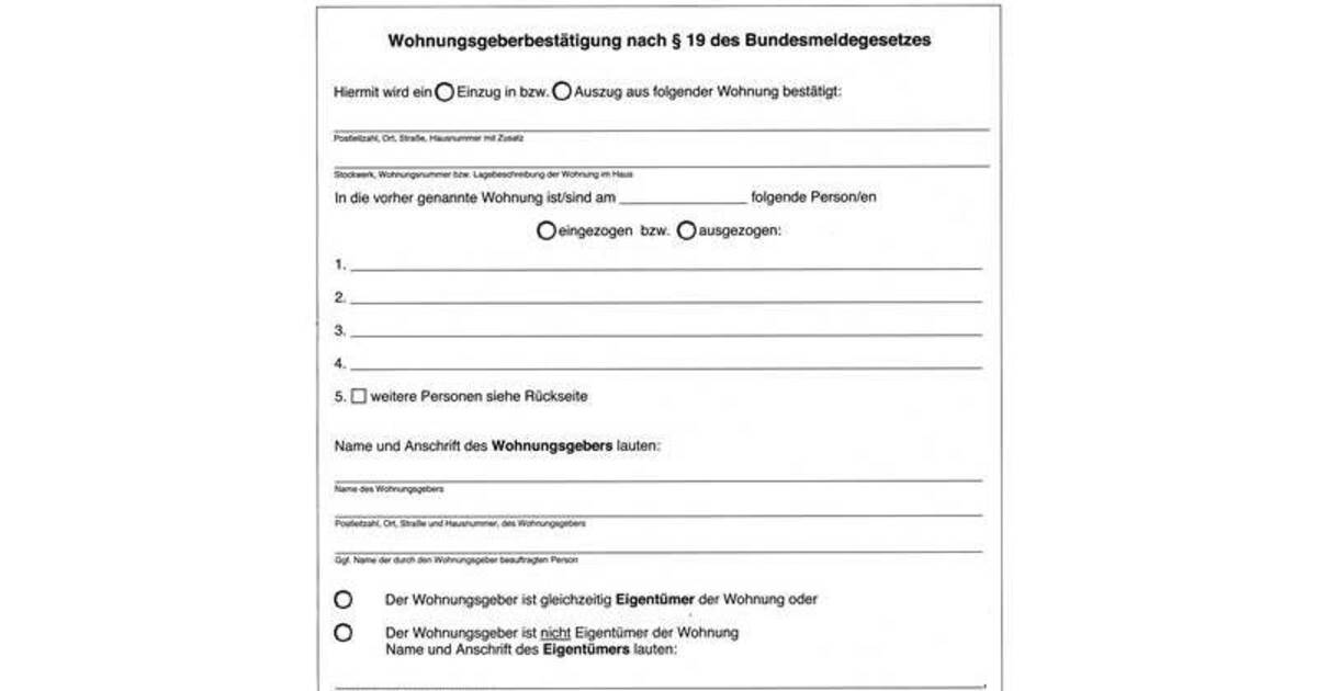 Weitere informationen finden sie unter folgender pressemitteilung. Eigentümer (bei eigenbezug durch eigentümer direkt zu nr. Wohnungsgeberbestätigung zur vorlage bei der meldebehörde (§ 19 des bundesmeldegesetz) angaben zum wohnungsgeber | und ggf. Wohnungsgeberbestätigung nach § 19 des bundesmeldegesetzes hiermit wird ein einzug in folgende wohnung bestätigt: