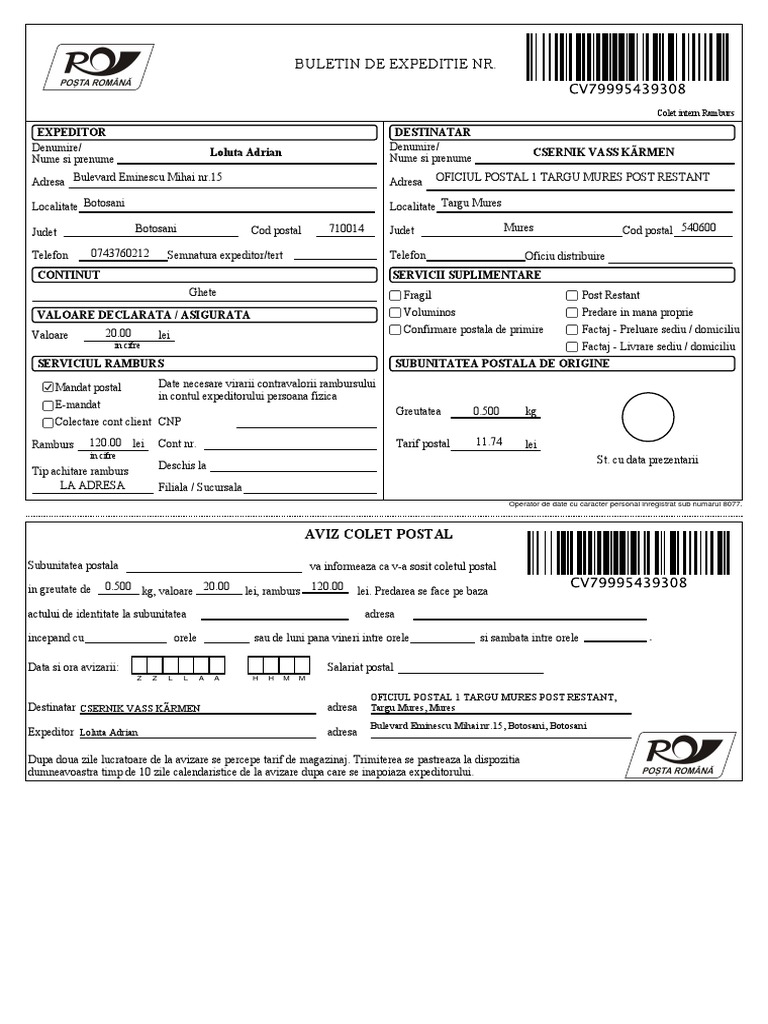 Formular Trimitere Colet Posta Romana. În conformitate cu prevederile regulamentului, cnpr a numit responsabilul cu protecţia datelor la nivelul organizaţiei şi oferă mai multe posibilităţi de comunicare şi informare referitoare la regulament, respectiv: Generare si printare documente si formulare pentru posta romana, completare, listare, buletin de expeditie, mandat postal formular pentru completarea buletinului de expeditie si a mandatului postal afla mai multe cookie consent script