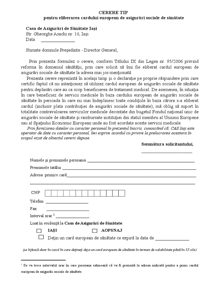 Indiferent de pachetul de asigurare contractat de tine beneficiezi de toate cele 3 componente ale ingrijirii sanatatii. 952006 privind reforma in domeniul sanatatii prin care solicit sa imi fie eliberat cardul european de asigurari sociale de sanatate la adresa mai jos. Certificat de nastere doar pentru minorii sub 14 ani Dovada calitatii de asigurat.