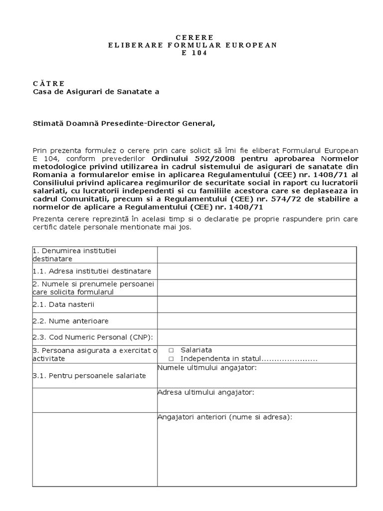 Formularul E 104 descarcare in format PDF ZIP 1Cerere. In Monitorul Oficial nr1036 din 6 decembrie 2018 a fost publicat Ordinul Casei Nationale de Asigurari de Sanatate nr1549 din 29 noiembrie 2018 privind aprobarea Normelor metodologice pentru stabilirea documentelor justificative privind dobandirea calitatii de asigurat. Cerere tip pentru eliberarea cardului european de asigurări sociale de sănătate.