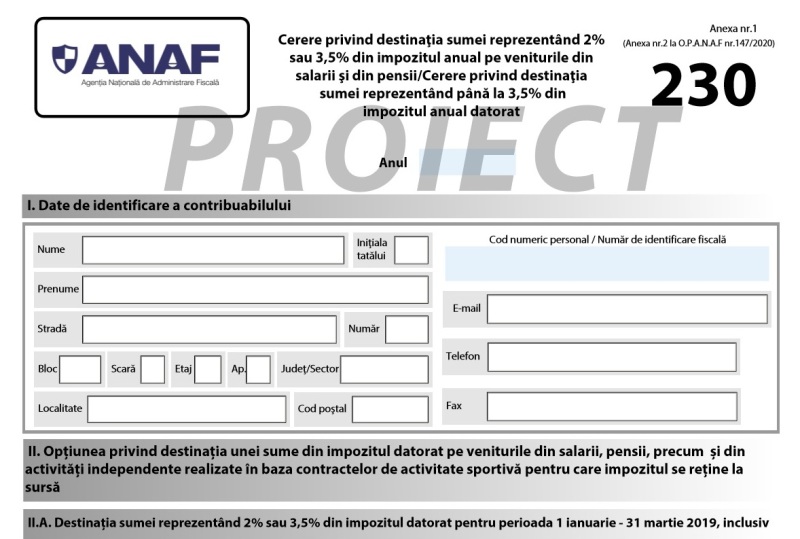 COMPLETAREA formularului 230 prevazut de Ordinul ANAF 6142020. Pentru îndeplinirea acestui obiectiv avem nevoie și de implicarea ta. Prin formularul 230 puteţi să direcţionaţi 2 din impozitul anual către o asociaţie nonprofit.