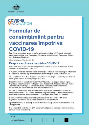 COVID-19 vaccines - Formular de consimțământ pentru vaccinarea împotriva COVID-19 Consent form for COVID-19 vaccination This consent form in Romanian must be completed before receiving a COVID-19 vaccination. Versiunea 30 11 martie 2021. în Germania au murit.